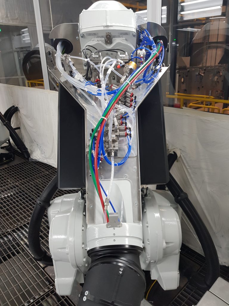 Gleich im ersten Quartal hat sich die ausgiebige Offlineprogrammierung und Vor- Inbetriebnahme einer Anlage bei uns in Landshut bezahlt gemacht. Hier haben wir den Auftrag für eine vollautomatische Roboterlackieranlage mit 12 Robotern, inklusive Farbversorgung erhalten. Die Farbversorgung hat neben mehreren Primer- und Klarlacksystemen zwölf Highrunner Basecoat- Ringleitungen und zusätzlich fünf molchbare Sonderfarbstationen für Farben, die nicht so oft lackiert werden. Der Vorteil dieser Systeme ist, dass man beim Spülen einen Großteil der Farbe zurückgewinnen kann. Das ist bei einer Ringleitungslänge von 80 Metern auch wichtig! Angesteuert wird das alles von einer einzigen SPS.